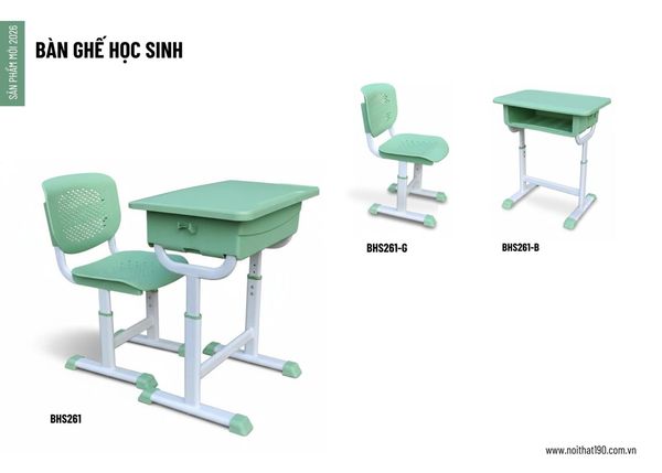 BHS261 là sản phẩm thuộc dòng bàn ghế học sinh.Bàn có thể điều chỉnh chiều cao. Mặt nhựa nguyên khối màu xanh. Khung thép sơn tĩnh điện màu trắng, chân có đệm nhựa cân bằng.