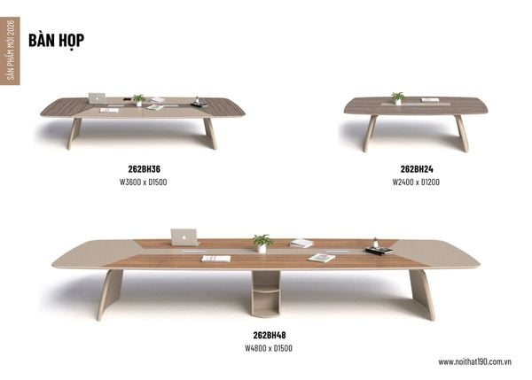Bàn 262BH24 thuộc dòng Bàn họp 2.4m, chân bằng thép hộp dày 40mm tạo hình cánh quạt, thanh giằng thép hộp. Mặt bàn gỗ MFC 2 lớp, lớp trên dày 17mm, lớp dưới dày 17mm cạnh vát chéo kèm 1 nắp nhôm lật 2 chiều.