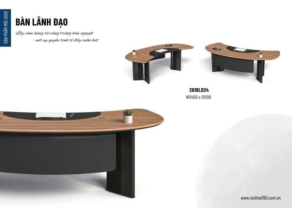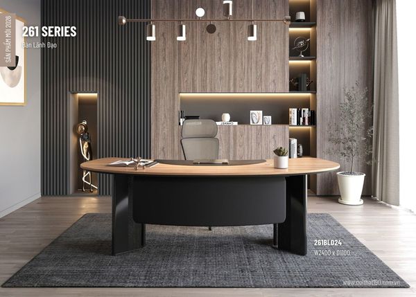 Bàn lãnh đạo 261BLD24 thuộc dòng bàn Bàn lãnh đạo, mặt bàn gỗ MFC 2 lớp, lớp trên dày 17mm có ghép tấm da ở giữa, lớp dưới dày 17mm cạnh vát chéo. Chân sắt mạ giả inox màu đen bóng được dập hộp tạo hình có phối gỗ laminate màu vân gỗ. Yếm khung sắt bọc da. Có 2 nắp tròn luồn dây inox.