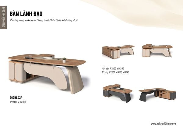 Bàn 262BLD24 thuộc dòng Bàn lãnh đạo có tủ phụ, mặt bàn gỗ MFC 2 lớp, lớp trên dày 17mm có ghép tấm da ở giữa, lớp dưới dày 17mm cạnh vát chéo. Chân bằng thép tạo hình cánh quạt sơn tĩnh điện màu đen/ vàng cát. Yếm bàn gỗ. Có 1 nắp nhôm luồn dây điện.